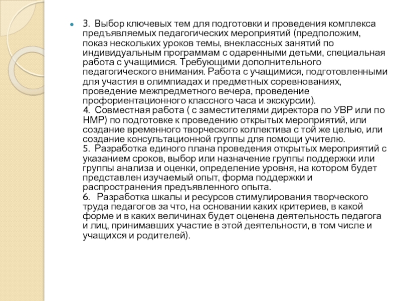 4. Совместная работа ( с заместителями директора по УВР или по НМР) по подготовке к проведению открытых мероприятий, или создание временного творческого коллектива с той же целью, или создание консультационной группы для помощи учителю.