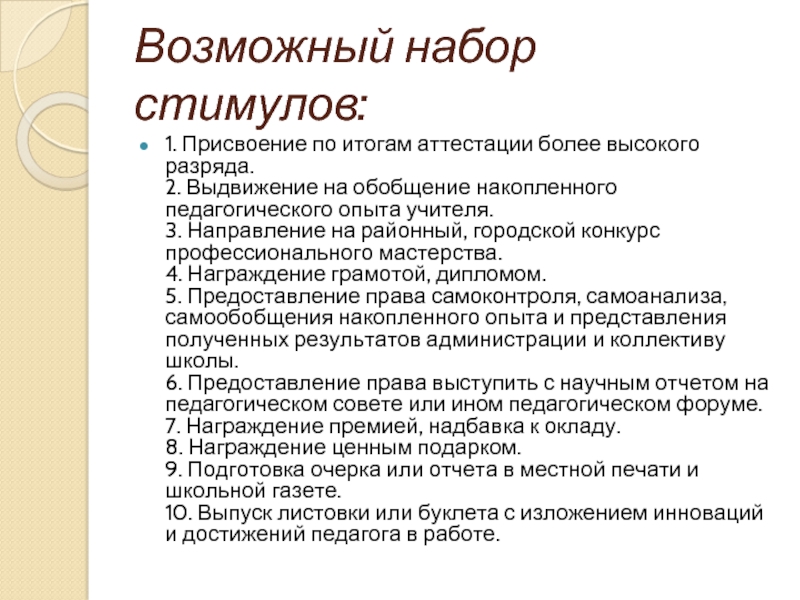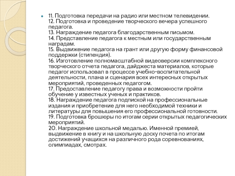 18. Награждение педагога подпиской на профессиональные издания и приобретение для него необходимой техники и литературы для повышения его профессиональной готовности.
