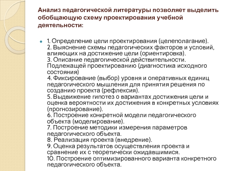 Слайд 2Анализ педагогической литературы позволяет выделить обобщающую схему проектирования учебной деятельности: