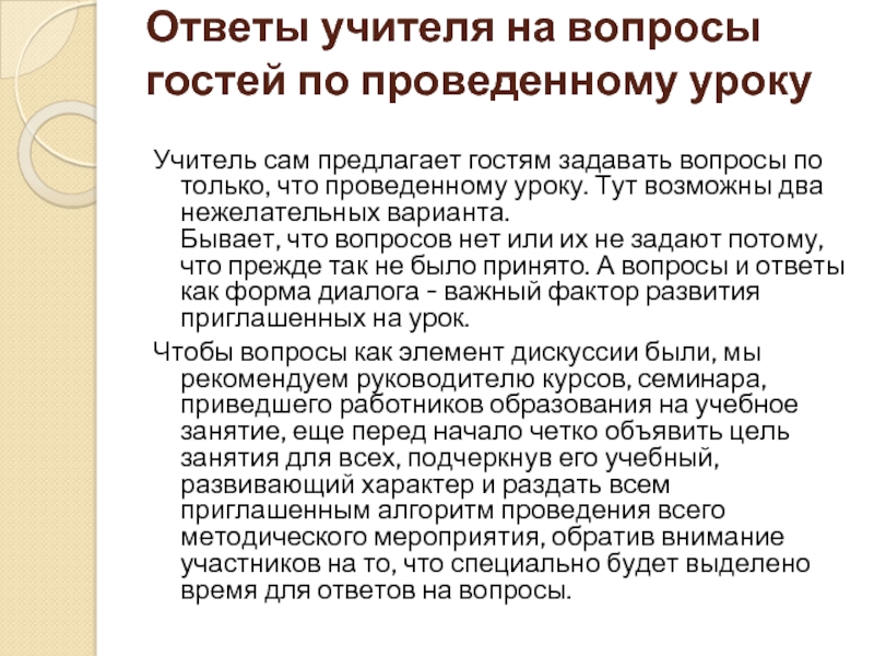 Слайд 10Ответы учителя на вопросы гостей по проведенному уроку