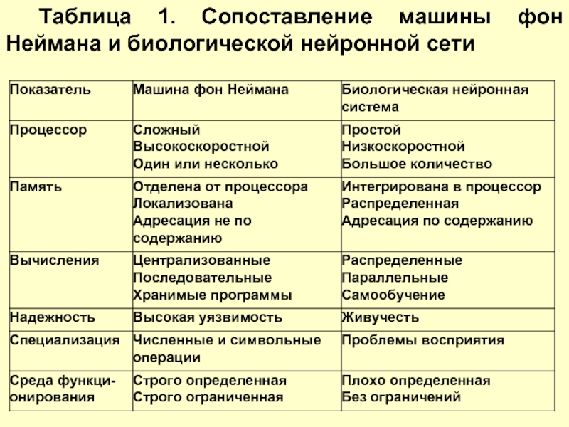 Слайд 61Таблица 1. Сопоставление машины фон Неймана и биологической нейронной сети