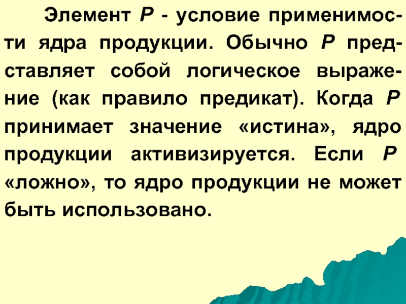 Слайд 29Элемент Р - условие применимос-ти ядра продукции. Обычнo Р пред-ставляет собой