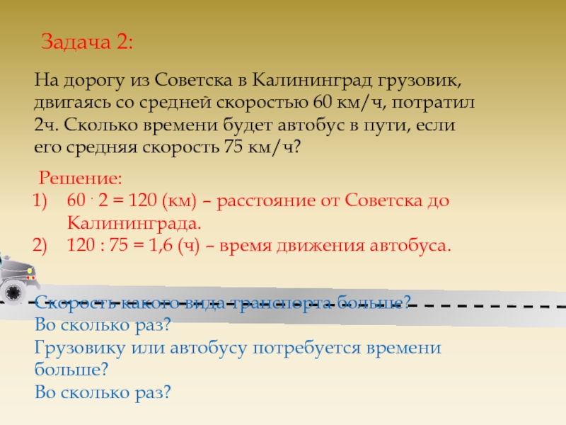 60 . 2 = 120 (км) – расстояние от Советска до Калининграда.