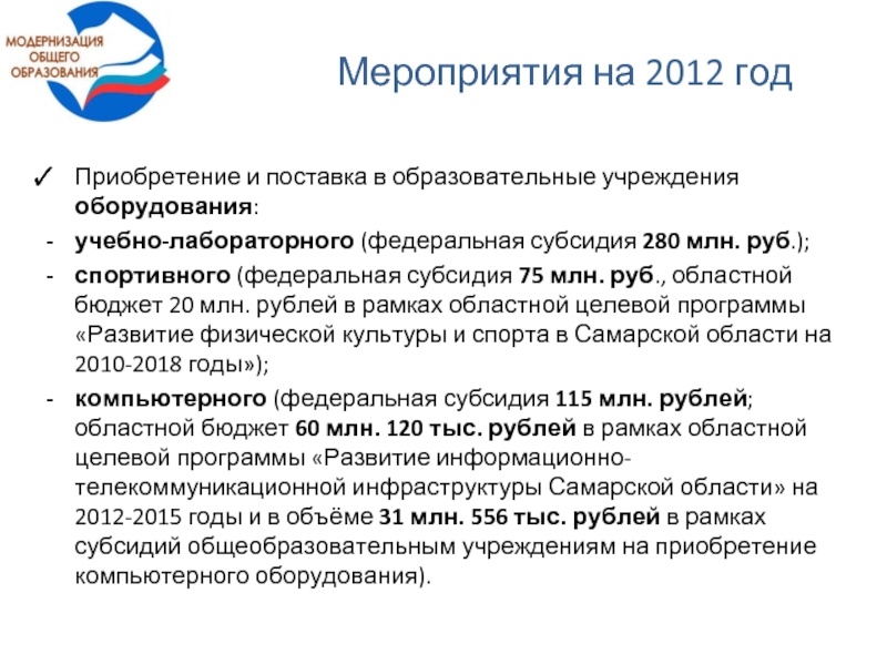 Размер субсидий из федерального бюджета бюджетам субъектов РФ на модернизацию региональных систем общего образования (млрд. руб.)