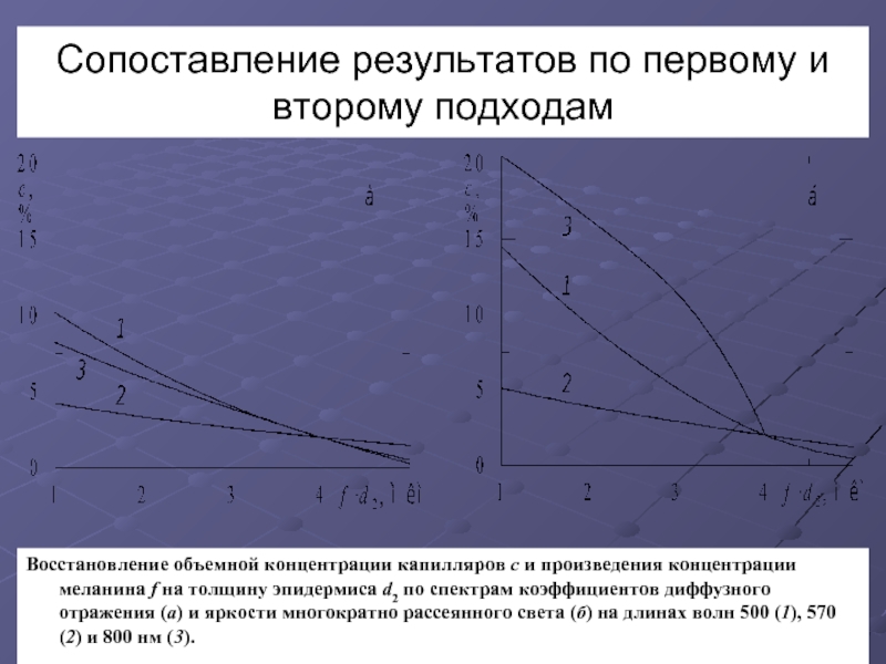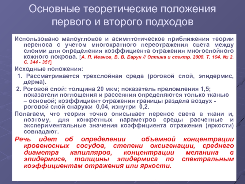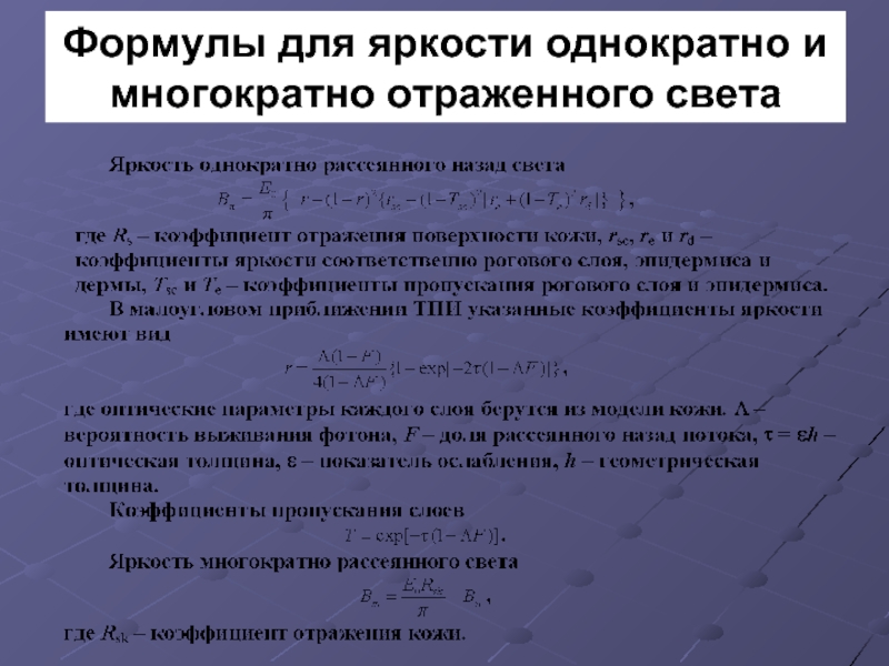 Здесь Во и Вм - яркости однократно и многократно отраженного излучения, α – поправочный коэффициент на частичную поляризацию многократно рассеянного излучения. Расчеты показывают, что при нормальном падении и наблюдении света величиной α по сравнению с 0,5 можно во многих случаях пренебречь. В такой ситуации, используя схему расчета, аналогичную первому подходу и измерение яркости в поляризованном свете, можно предложить эквивалентную, ранее рассмотренной, методику определение структуры и состава кожи