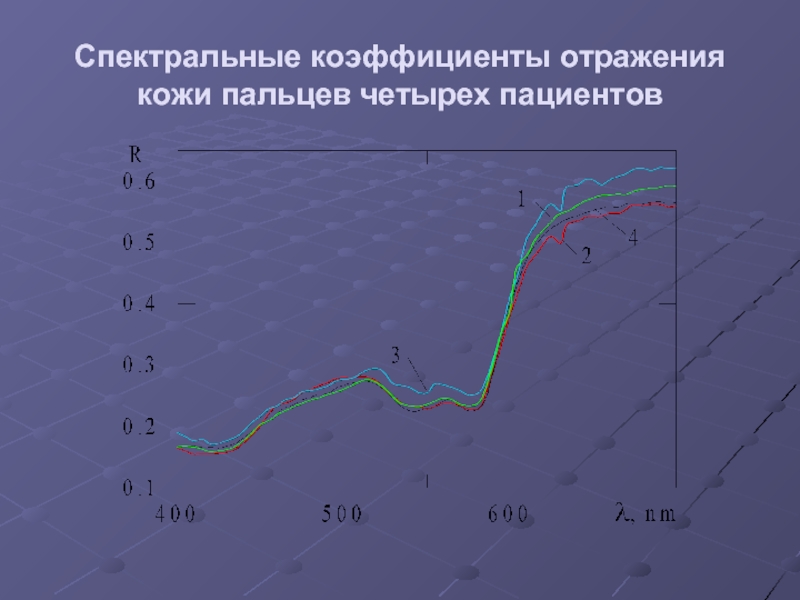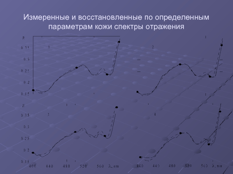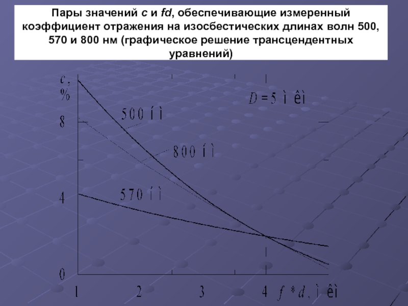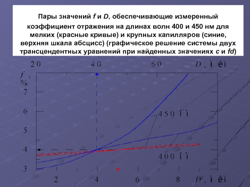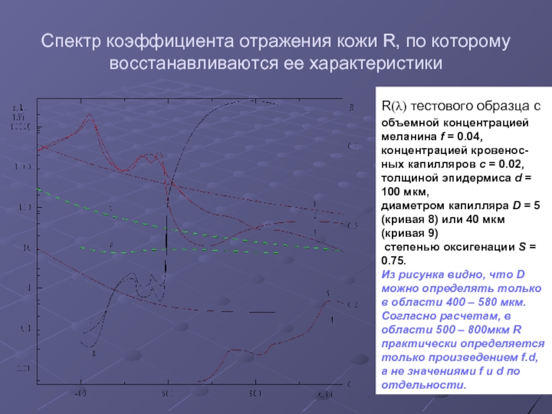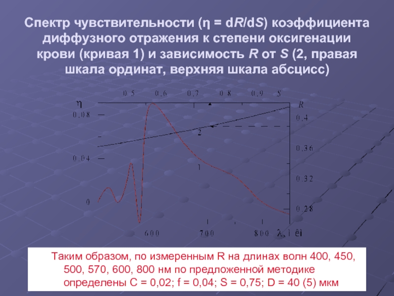Таким образом, по измеренным R на длинах волн 400, 450, 500, 570, 600, 800 нм по предложенной методике определены C = 0,02; f = 0,04; S = 0,75; D = 40 (5) мкм