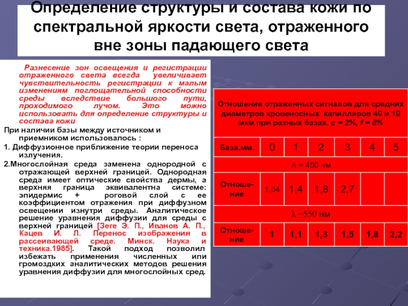 Разнесение зон освещения и регистрации отраженного света всегда увеличивает чувствительность регистрации к малым изменениям поглощательной способности среды вследствие большого пути, проходимого лучом. Это можно использовать для определение структуры и состава кожи