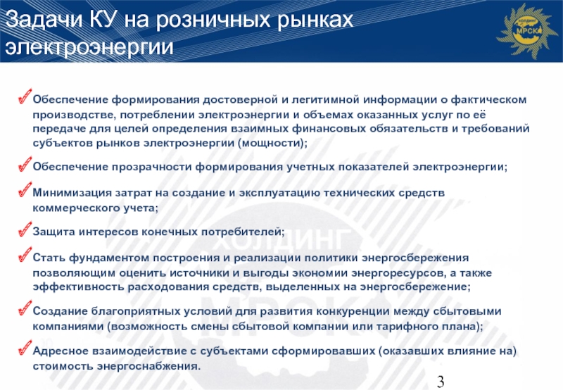 Сбытовая компания – потребитель данных коммерческого учета, контролер выполнения условий договоров купли-продажи (энергоснабжения, оказания услуг по передаче электрической энергии) субъектами розничных рынков электрической энергии.