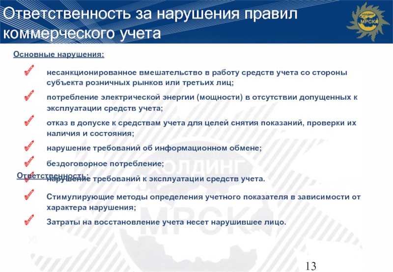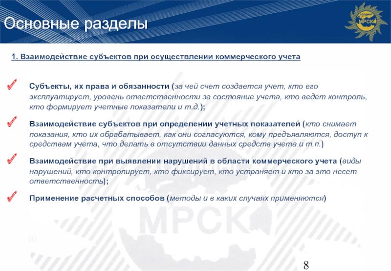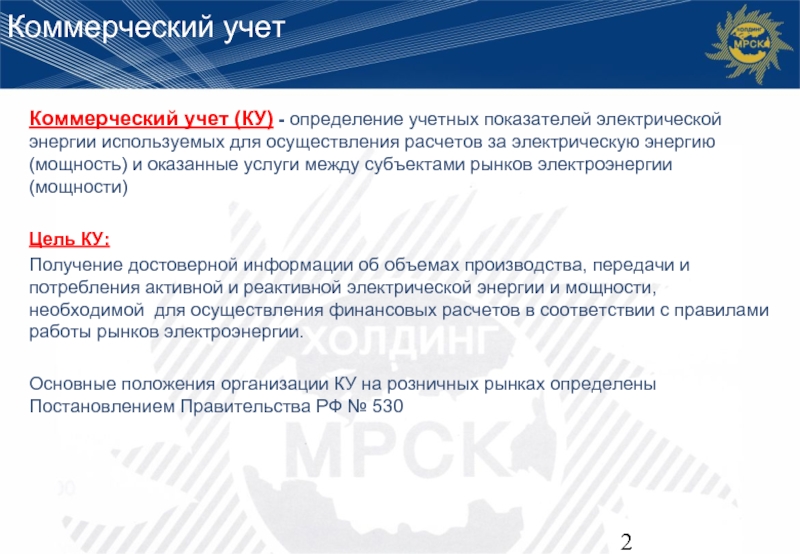 Сетевая компания – обеспечивает создание и эксплуатацию систем учета, обеспечивает сбор и обработку данных систем коммерческого учета, контроль соблюдения требований правил коммерческого учета.