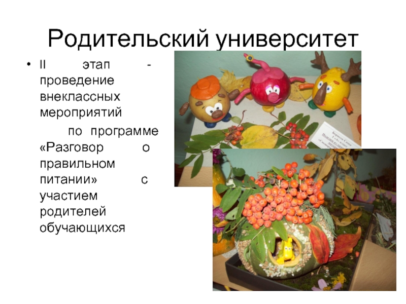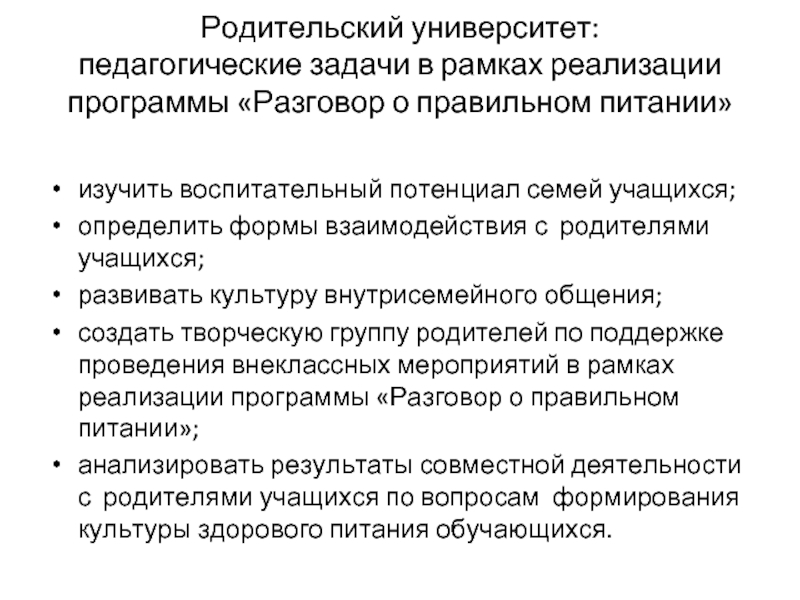 создать творческую группу родителей по поддержке проведения внеклассных мероприятий в рамках реализации программы «Разговор о правильном питании»;