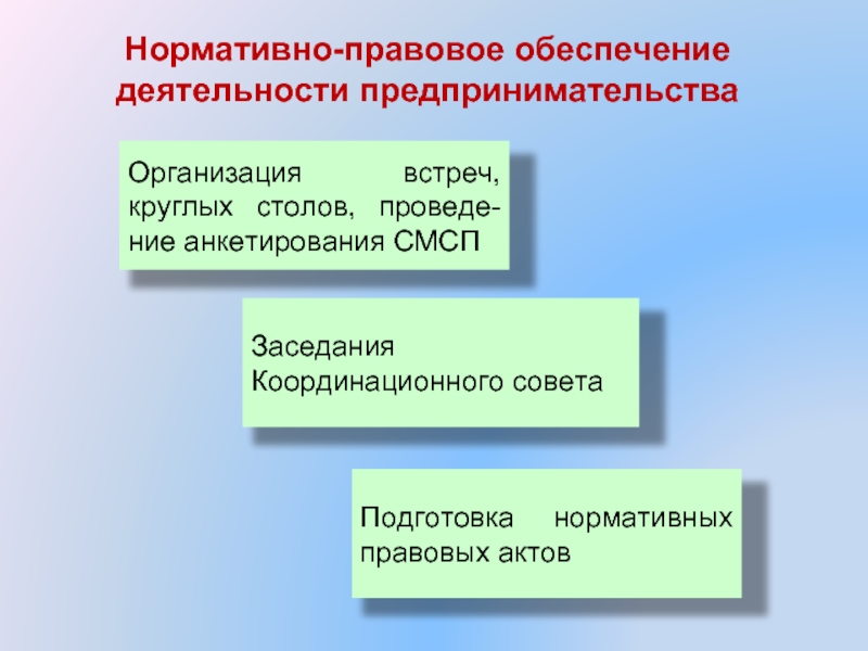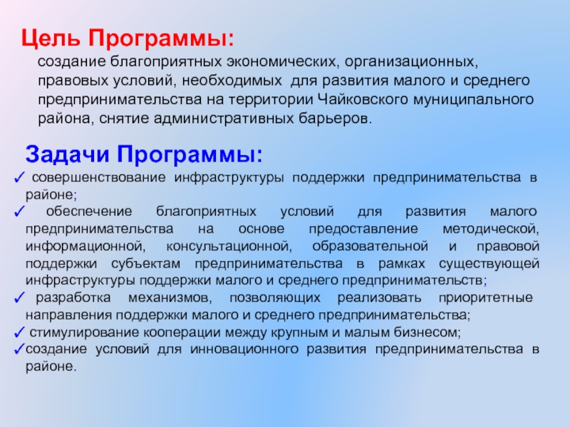 обеспечение благоприятных условий для развития малого предпринимательства на основе предоставление методической, информационной, консультационной, образовательной и правовой поддержки субъектам предпринимательства в рамках существующей инфраструктуры поддержки малого и среднего предпринимательств;