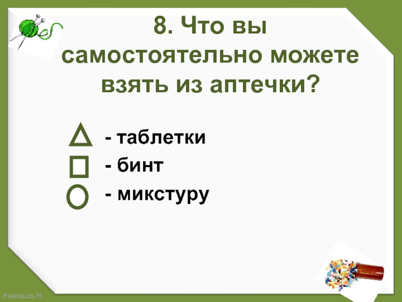 Слайд 108. Что вы самостоятельно можете взять из аптечки?
