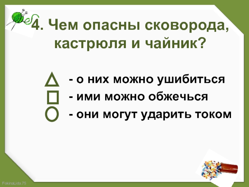 Слайд 64. Чем опасны сковорода, кастрюля и чайник?