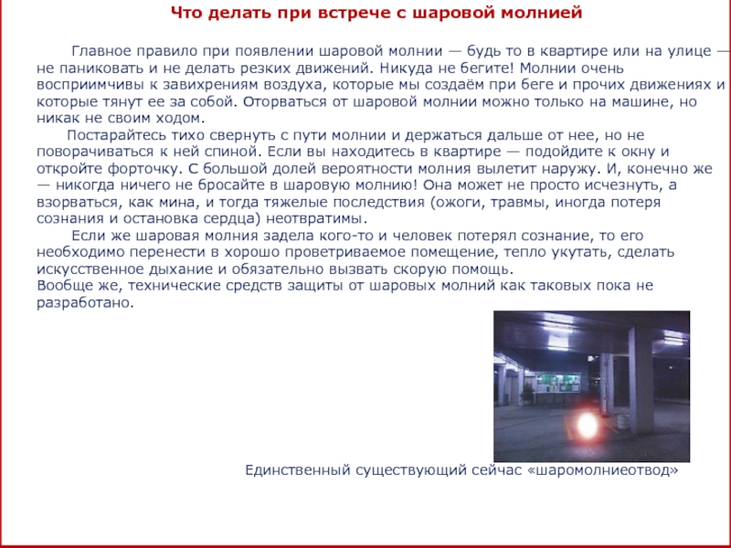 Постарайтесь тихо свернуть с пути молнии и держаться дальше от нее, но не поворачиваться к ней спиной. Если вы находитесь в квартире — подойдите к окну и откройте форточку. С большой долей вероятности молния вылетит наружу. И, конечно же — никогда ничего не бросайте в шаровую молнию! Она может не просто исчезнуть, а взорваться, как мина, и тогда тяжелые последствия (ожоги, травмы, иногда потеря сознания и остановка сердца) неотвратимы.