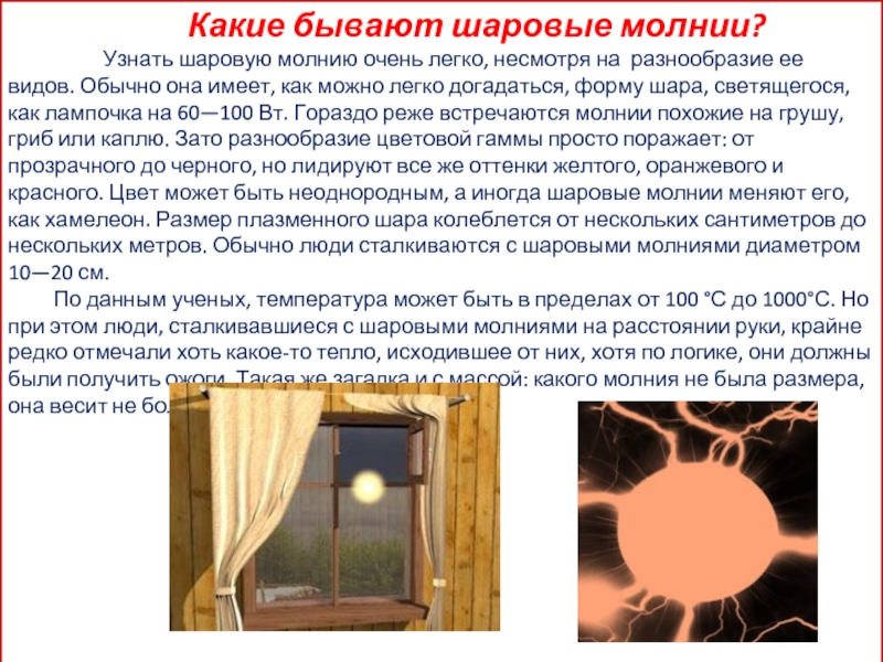 Узнать шаровую молнию очень легко, несмотря на разнообразие ее видов. Обычно она имеет, как можно легко догадаться, форму шара, светящегося, как лампочка на 60—100 Вт. Гораздо реже встречаются молнии похожие на грушу, гриб или каплю. Зато разнообразие цветовой гаммы просто поражает: от прозрачного до черного, но лидируют все же оттенки желтого, оранжевого и красного. Цвет может быть неоднородным, а иногда шаровые молнии меняют его, как хамелеон. Размер плазменного шара колеблется от нескольких сантиметров до нескольких метров. Обычно люди сталкиваются с шаровыми молниями диаметром 10—20 см.