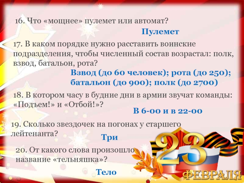 19. Сколько звездочек на погонах у старшего лейтенанта?