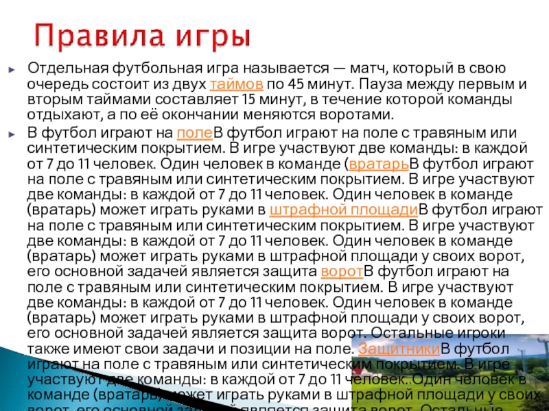 В футбол играют на полеВ футбол играют на поле с травяным или синтетическим покрытием. В игре участвуют две команды: в каждой от 7 до 11 человек. Один человек в команде (вратарьВ футбол играют на поле с травяным или синтетическим покрытием. В игре участвуют две команды: в каждой от 7 до 11 человек. Один человек в команде (вратарь) может играть руками в штрафной площадиВ футбол играют на поле с травяным или синтетическим покрытием. В игре участвуют две команды: в каждой от 7 до 11 человек. Один человек в команде (вратарь) может играть руками в штрафной площади у своих ворот, его основной задачей является защита воротВ футбол играют на поле с травяным или синтетическим покрытием. В игре участвуют две команды: в каждой от 7 до 11 человек. Один человек в команде (вратарь) может играть руками в штрафной площади у своих ворот, его основной задачей является защита ворот. Остальные игроки также имеют свои задачи и позиции на поле. ЗащитникиВ футбол играют на поле с травяным или синтетическим покрытием. В игре участвуют две команды: в каждой от 7 до 11 человек. Один человек в команде (вратарь) может играть руками в штрафной площади у своих ворот, его основной задачей является защита ворот. Остальные игроки также имеют свои задачи и позиции на поле. Защитники располагаются в основном на своей половине поля, их задача — противодействовать нападающим игрокам противоположной команды. ПолузащитникиВ футбол играют на поле с травяным или синтетическим покрытием. В игре участвуют две команды: в каждой от 7 до 11 человек. Один человек в команде (вратарь) может играть руками в штрафной площади у своих ворот, его основной задачей является защита ворот. Остальные игроки также имеют свои задачи и позиции на поле. Защитники располагаются в основном на своей половине поля, их задача — противодействовать нападающим игрокам противоположной команды. Полузащитники действуют в середине поля, их роль — помогать защитникам или нападающим в зависимости от игровой ситуации. НападающиеВ футбол играют на поле с травяным или синтетическим покрытием. В игре участвуют две команды: в каждой от 7 до 11 человек. Один человек в команде (вратарь) может играть руками в штрафной площади у своих ворот, его основной задачей является защита ворот. Остальные игроки также имеют свои задачи и позиции на поле. Защитники располагаются в основном на своей половине поля, их задача — противодействовать нападающим игрокам противоположной команды. Полузащитники действуют в середине поля, их роль — помогать защитникам или нападающим в зависимости от игровой ситуации. Нападающие располагаются, преимущественно на половине поля соперника, основная задача — забивать голы.