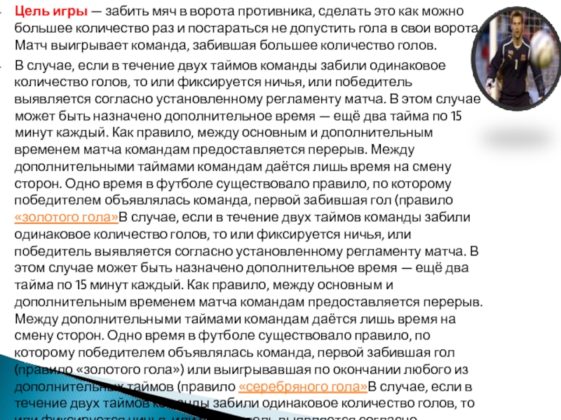 Слайд 5Цель игры — забить мяч в ворота противника, сделать это как можно