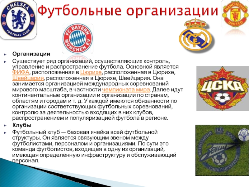 ФИФА, расположенная в Цюрихе, расположенная в Цюрихе, Швейцария, расположенная в Цюрихе, Швейцария. Она занимается организацией международных соревнований мирового масштаба, в частности чемпионата мира. Далее идут континентальные организации и организации по странам, областям и городам и т. д. У каждой имеются обязанности по организации соответствующих футбольных соревнований, контролю за деятельностью входящих в них клубов, распространением и популяризацией футбола в регионе.