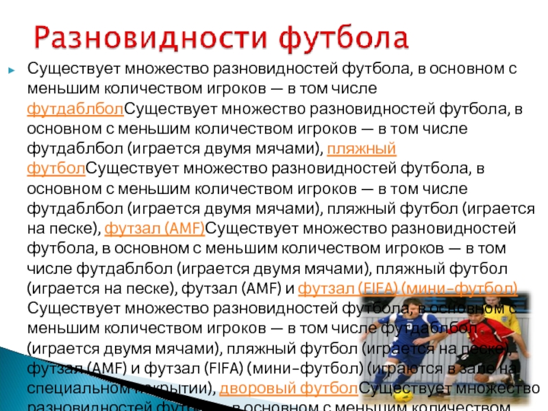 том числе футдаблболСуществует множество разновидностей футбола, в основном с меньшим количеством игроков — в том числе футдаблбол (играется двумя мячами), пляжный футболСуществует множество разновидностей футбола, в основном с меньшим количеством игроков — в том числе футдаблбол (играется двумя мячами), пляжный футбол (играется на песке), футзал (AMF)Существует множество разновидностей футбола, в основном с меньшим количеством игроков — в том числе футдаблбол (играется двумя мячами), пляжный футбол (играется на песке), футзал (AMF) и футзал (FIFA) (мини-футбол)Существует множество разновидностей футбола, в основном с меньшим количеством игроков — в том числе футдаблбол (играется двумя мячами), пляжный футбол (играется на песке), футзал (AMF) и футзал (FIFA) (мини-футбол) (играются в зале на специальном покрытии), дворовый футболСуществует множество разновидностей футбола, в основном с меньшим количеством игроков — в том числе футдаблбол (играется двумя мячами), пляжный футбол (играется на песке), футзал (AMF) и футзал (FIFA) (мини-футбол) (играются в зале на специальном покрытии), дворовый футбол (играется на любом покрытии на полях любого размера любым количеством людей), болотный футболСуществует множество разновидностей футбола, в основном с меньшим количеством игроков — в том числе футдаблбол (играется двумя мячами), пляжный футбол (играется на песке), футзал (AMF) и футзал (FIFA) (мини-футбол) (играются в зале на специальном покрытии), дворовый футбол (играется на любом покрытии на полях любого размера любым количеством людей), болотный футбол (играется на болоте), футбольный фристайл (заключается в исполнении всевозможных финтов и трюков).