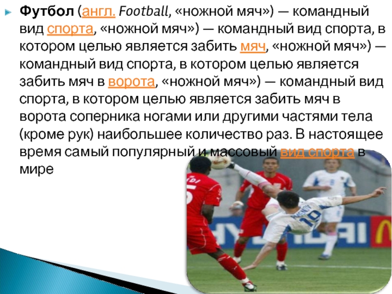 вид спорта, в котором целью является забить мяч, «ножной мяч») — командный вид спорта, в котором целью является забить мяч в ворота, «ножной мяч») — командный вид спорта, в котором целью является забить мяч в ворота соперника ногами или другими частями тела (кроме рук) наибольшее количество раз. В настоящее время самый популярный и массовый вид спорта в мире
