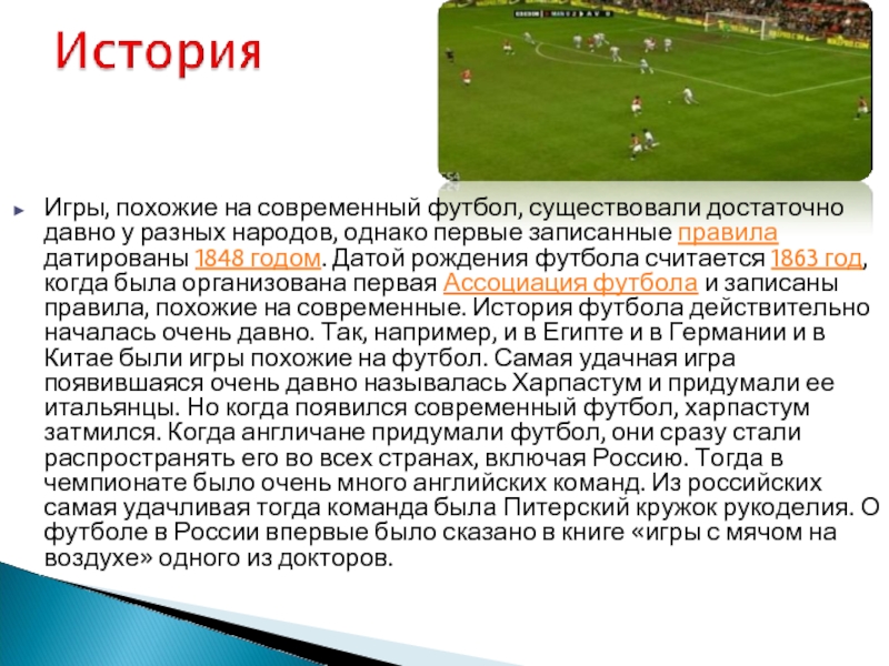 однако первые записанные правила датированы 1848 годом. Датой рождения футбола считается 1863 год, когда была организована первая Ассоциация футбола и записаны правила, похожие на современные. История футбола действительно началась очень давно. Так, например, и в Египте и в Германии и в Китае были игры похожие на футбол. Самая удачная игра появившаяся очень давно называлась Харпастум и придумали ее итальянцы. Но когда появился современный футбол, харпастум затмился. Когда англичане придумали футбол, они сразу стали распространять его во всех странах, включая Россию. Тогда в чемпионате было очень много английских команд. Из российских самая удачливая тогда команда была Питерский кружок рукоделия. О футболе в России впервые было сказано в книге «игры с мячом на воздухе» одного из докторов.