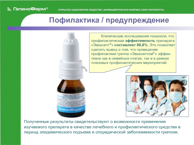 Полученные результаты свидетельствуют о возможности применения изучаемого препарата в качестве лечебного и профилактического средства в период эпидемического подъема и спорадической заболеваемости гриппом.