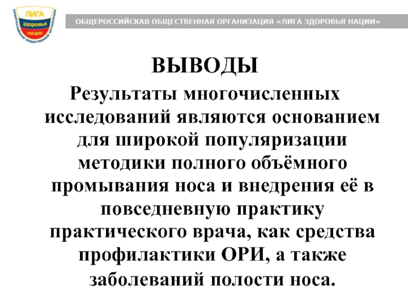 промывания носа и внедрения её в повседневную практику практического врача, как средства профилактики ОРИ, а также заболеваний полости носа.