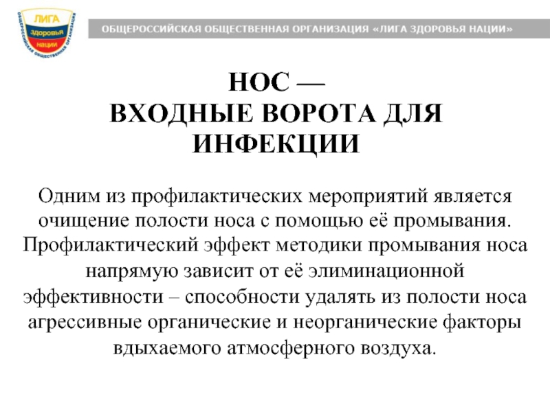 Профилактический эффект методики промывания носа напрямую зависит от её элиминационной эффективности – способности удалять из полости носа агрессивные органические и неорганические факторы вдыхаемого атмосферного воздуха.