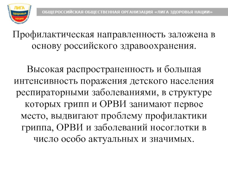 поражения детского населения респираторными заболеваниями, в структуре которых грипп и ОРВИ занимают первое место, выдвигают проблему профилактики гриппа, ОРВИ и заболеваний носоглотки в число особо актуальных и значимых.
