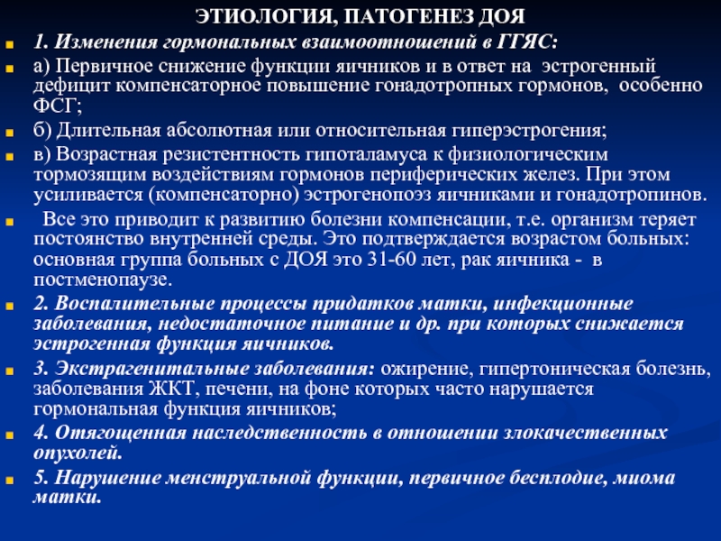 Все это приводит к развитию болезни компенсации, т.е. организм теряет постоянство внутренней среды. Это подтверждается возрастом больных: основная группа больных с ДОЯ это 31-60 лет, рак яичника - в постменопаузе.