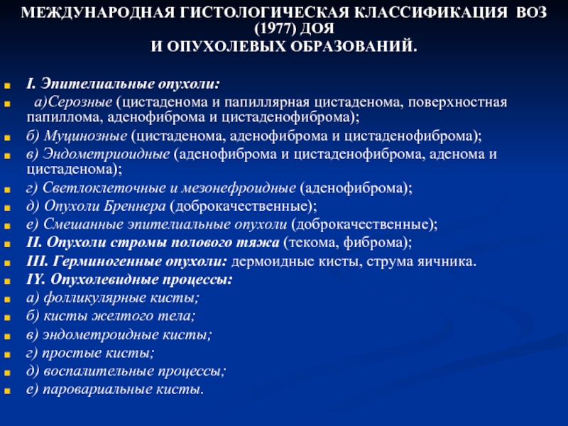 Слайд 2МЕЖДУНАРОДНАЯ ГИСТОЛОГИЧЕСКАЯ КЛАССИФИКАЦИЯ ВОЗ (1977) ДОЯ