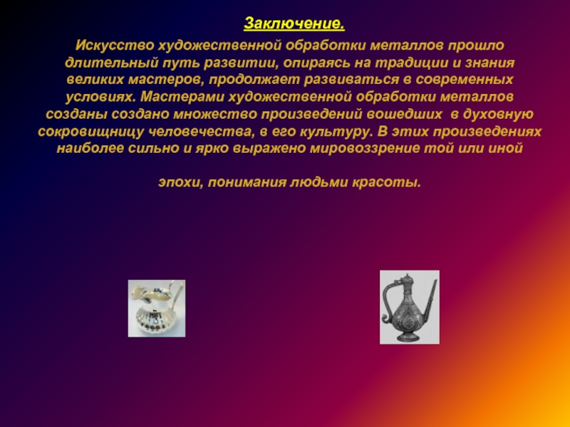 на традиции и знания великих мастеров, продолжает развиваться в современных условиях. Мастерами художественной обработки металлов созданы создано множество произведений вошедших в духовную сокровищницу человечества, в его культуру. В этих произведениях наиболее сильно и ярко выражено мировоззрение той или иной эпохи, понимания людьми красоты.