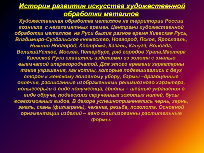 России возникла с незапамятных времен. Центрами художественной обработки металлов на Руси былив разное время Киевская Русь, Владимиро-Суздальское княжество, Новгород, Псков, Ярославль, Нижний Новгород, Кострома, Казань, Калуга, Вологда, ВеликийУстюг, Москва, Петербург, ряд городов Урала.Мастера Киевской Руси славились изделиями из золота с эмалью выемчатой иперегородчатой. Для этого времени характерны такие украшения, как котлы, которые подвешивались с двух сторон к женскому головному убору, бармы –драгоценные оплечья, расписанные изображениями религиозного характера, полыесерьги в виде полумесяца, гривны – шейные украшения в виде обруча, подвескииз скрученных золотых нитей, бусы всевозможных видов. В декоре успешноприменялись чернь, зернь, эмаль, скань (филигрань), чеканка, резьба, позолота. Основной орнаментации изделий – явно стилизованны растительные формы.