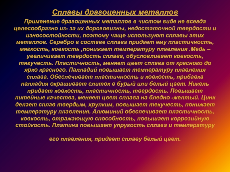 целесообразно из- за их дороговизны, недостаточной твердости и износостойкости, поэтому чаще используют сплавы этих металлов. Серебро в составе сплава придает ему пластичность, мягкость, ковкость ,понижает температуру плавления .Медь – увеличивает твердость сплава, обусловливает ковкость, тягучесть. Пластичность, меняет цвет сплава от красного до ярко красного. Палладий повышает температуру плавления сплава. Обеспечивает пластичность и ковкость, прибавка палладия окрашивает слиток в бурый или белый цвет. Никель придает ковкость, пластичность, твердость. Повышает литейные качества, меняет цвет сплава на бледно -желтый. Цинк делает сплав твердым, хрупким, повышает текучесть, понижает температуру плавления. Алюминий обеспечивает пластичность, ковкость, отражающую способность, повышает коррозийную стойкость. Платина повышает упругость сплава и температуру его плавления, придает сплаву белый цвет.