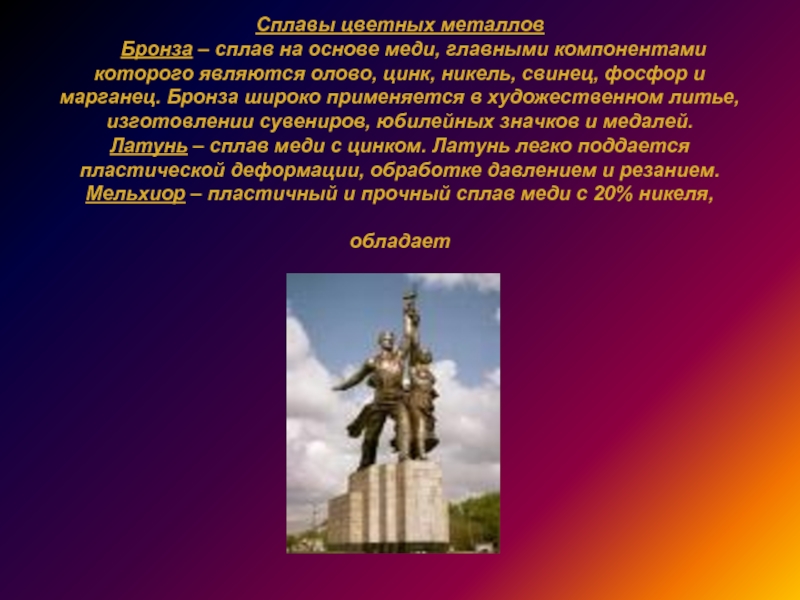 главными компонентами которого являются олово, цинк, никель, свинец, фосфор и марганец. Бронза широко применяется в художественном литье, изготовлении сувениров, юбилейных значков и медалей.