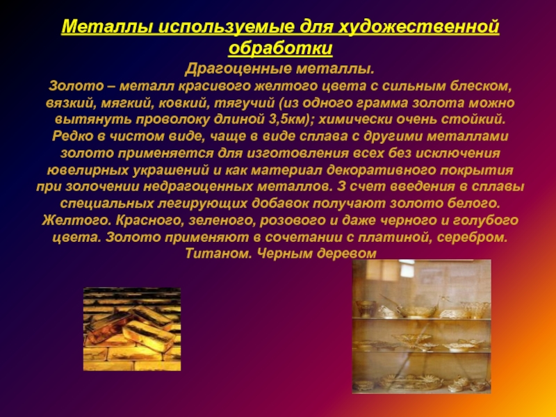 с сильным блеском, вязкий, мягкий, ковкий, тягучий (из одного грамма золота можно вытянуть проволоку длиной 3,5км); химически очень стойкий. Редко в чистом виде, чаще в виде сплава с другими металлами золото применяется для изготовления всех без исключения ювелирных украшений и как материал декоративного покрытия при золочении недрагоценных металлов. З счет введения в сплавы специальных легирующих добавок получают золото белого. Желтого. Красного, зеленого, розового и даже черного и голубого цвета. Золото применяют в сочетании с платиной, серебром. Титаном. Черным деревом