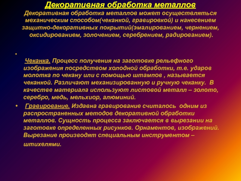 Декоративная обработка металлов может осуществляться механическим способом(чеканкой, гравировкой) и