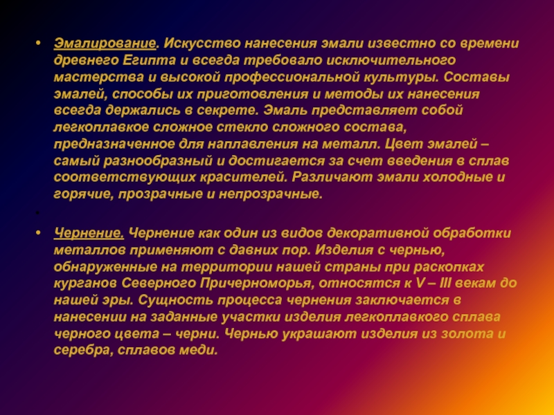требовало исключительного мастерства и высокой профессиональной культуры. Составы эмалей, способы их приготовления и методы их нанесения всегда держались в секрете. Эмаль представляет собой легкоплавкое сложное стекло сложного состава, предназначенное для наплавления на металл. Цвет эмалей – самый разнообразный и достигается за счет введения в сплав соответствующих красителей. Различают эмали холодные и горячие, прозрачные и непрозрачные.