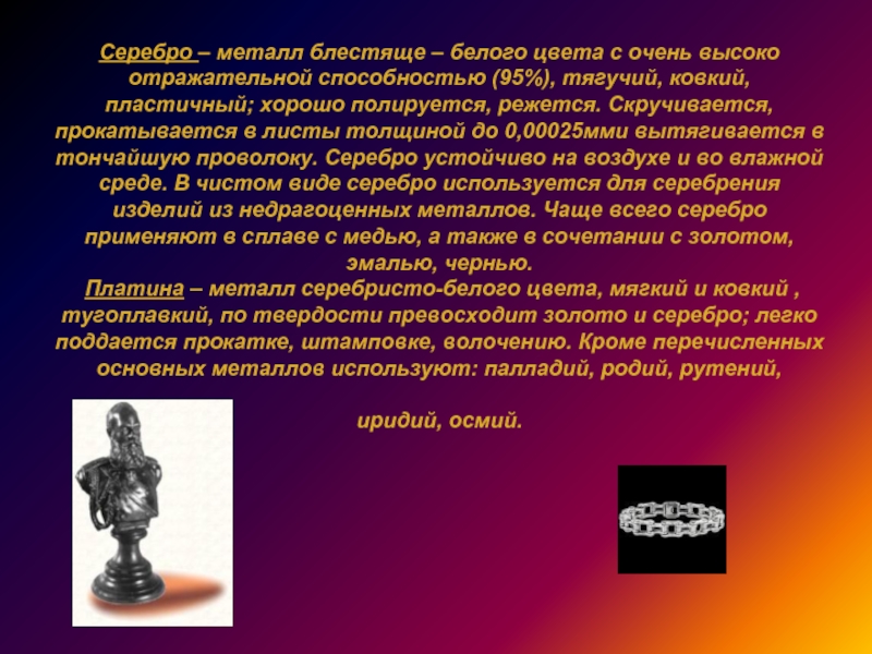 способностью (95%), тягучий, ковкий, пластичный; хорошо полируется, режется. Скручивается, прокатывается в листы толщиной до 0,00025мми вытягивается в тончайшую проволоку. Серебро устойчиво на воздухе и во влажной среде. В чистом виде серебро используется для серебрения изделий из недрагоценных металлов. Чаще всего серебро применяют в сплаве с медью, а также в сочетании с золотом, эмалью, чернью.