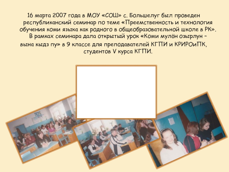 республиканский семинар по теме «Преемственность и технология обучения коми языка как родного в общеобразовательной школе в РК». В рамках семинара дала открытый урок «Коми мулöн озырлун –