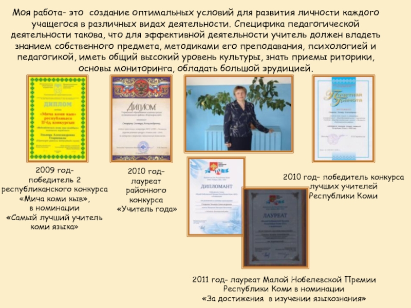 2011 год- лауреат Малой Нобелевской Премии Республики Коми в номинации