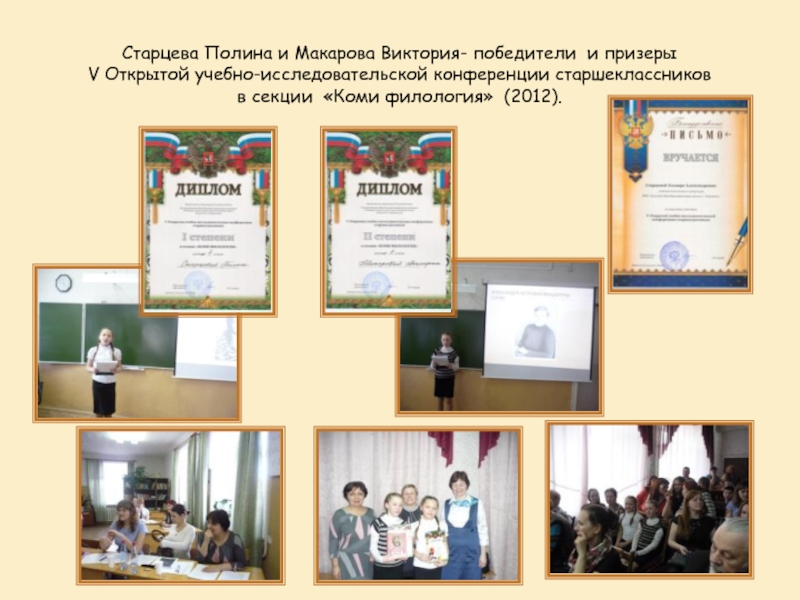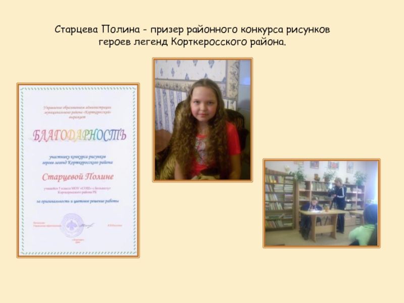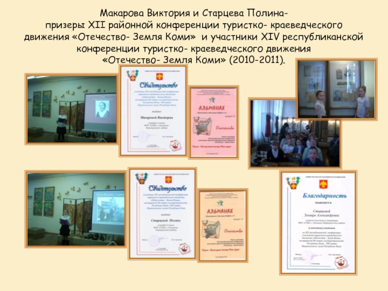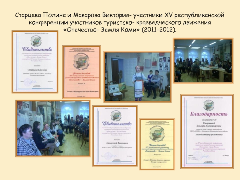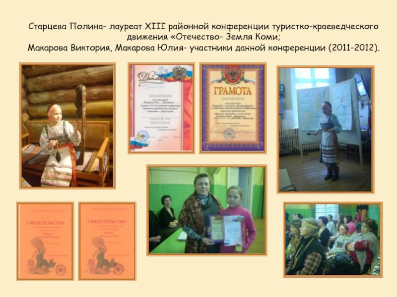Слайд 47Старцева Полина- лауреат XIII районной конференции туристко-краеведческого движения «Отечество- Земля Коми;