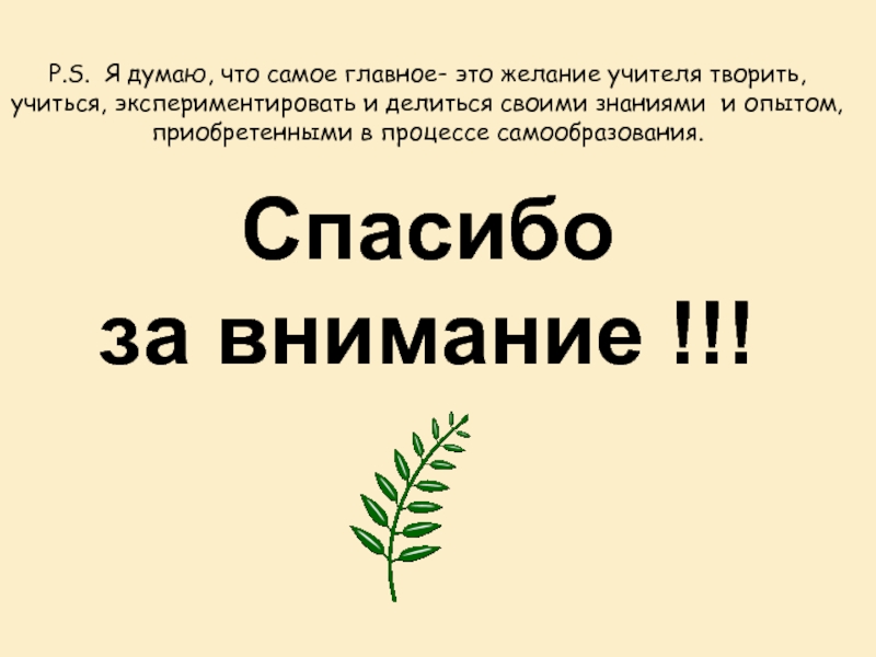 Моя работа- это создание оптимальных условий для развития личности каждого учащегося в различных видах деятельности. Специфика педагогической деятельности такова, что для эффективной деятельности учитель должен владеть знанием собственного предмета, методиками его преподавания, психологией и педагогикой, иметь общий высокий уровень культуры, знать приемы риторики, основы мониторинга, обладать большой эрудицией.