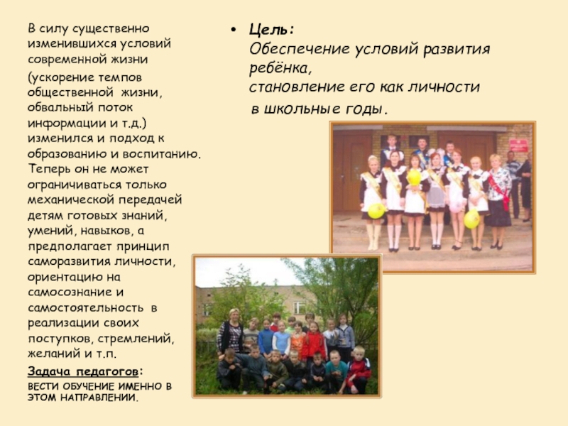 (ускорение темпов общественной жизни, обвальный поток информации и т.д.) изменился и подход к образованию и воспитанию. Теперь он не может ограничиваться только механической передачей детям готовых знаний, умений, навыков, а предполагает принцип саморазвития личности, ориентацию на самосознание и самостоятельность в реализации своих поступков, стремлений, желаний и т.п.