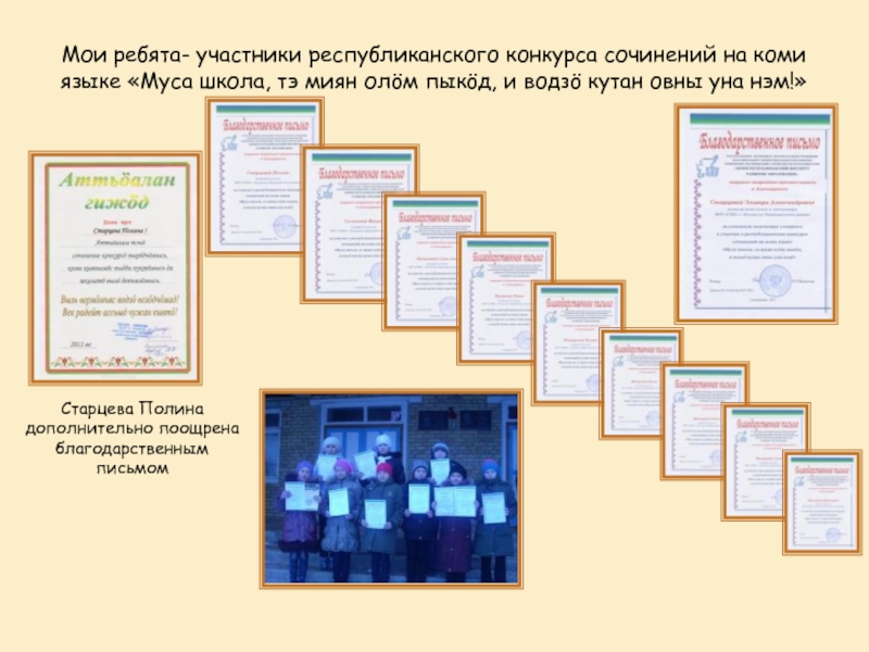 Слайд 61Мои ребята- участники республиканского конкурса сочинений на коми языке «Муса школа,
