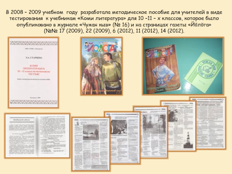 в виде тестирования к учебникам «Коми литература» для 10 –11 – х классов, которое было опубликовано в журнале «Чужан кыв» (№ 16) и на страницах газеты «Йöлöга»