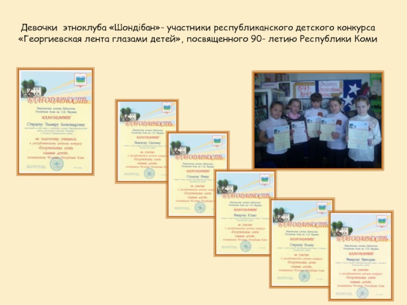 Слайд 60Девочки этноклуба «Шондібан»- участники республиканского детского конкурса «Георгиевская лента глазами детей»,