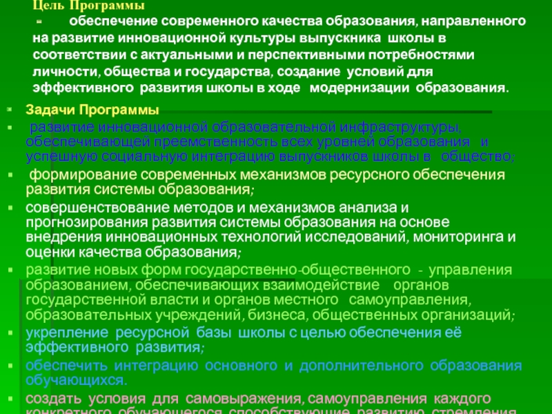 обеспечение современного качества образования, направленного на развитие инновационной культуры выпускника школы в соответствии с актуальными и перспективными потребностями личности, общества и государства, создание условий для эффективного развития школы в ходе модернизации образования.