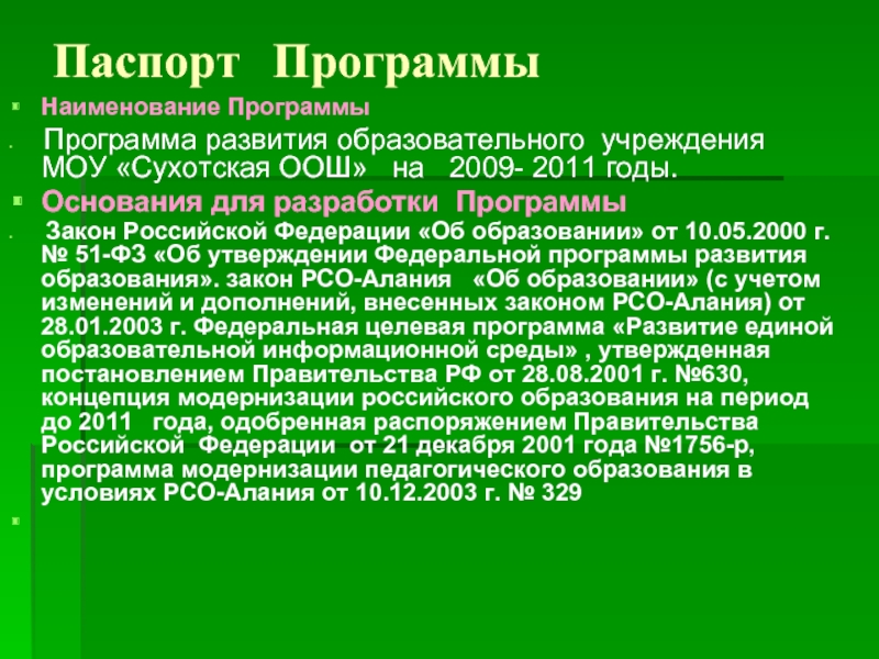 Закон Российской Федерации «Об образовании» от 10.05.2000 г. № 51-ФЗ «Об утверждении Федеральной программы развития образования». закон РСО-Алания «Об образовании» (с учетом изменений и дополнений, внесенных законом РСО-Алания) от 28.01.2003 г. Федеральная целевая программа «Развитие единой образовательной информационной среды» , утвержденная постановлением Правительства РФ от 28.08.2001 г. №630, концепция модернизации российского образования на период до 2011 года, одобренная распоряжением Правительства Российской Федерации от 21 декабря 2001 года №1756-р, программа модернизации педагогического образования в условиях РСО-Алания от 10.12.2003 г. № 329